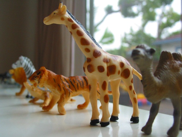 Miles has a dozen 2"-high plastic animals and has learned all their names. This is "Jaff." To his left is "Tigo," to his right is "Kamah."
